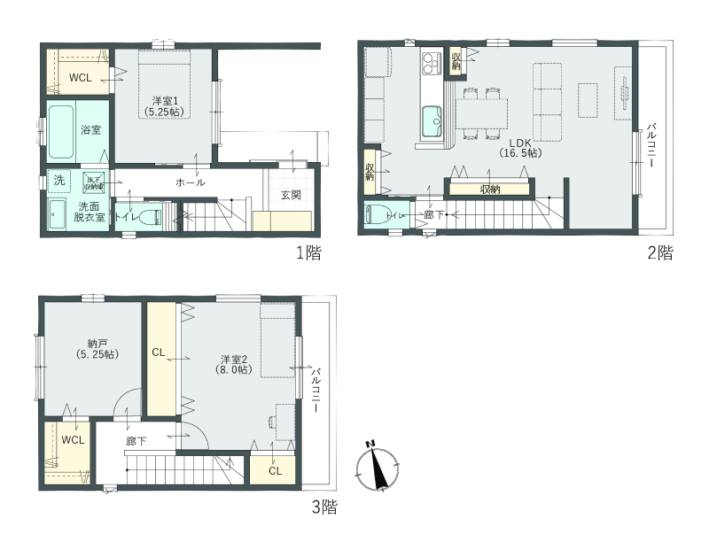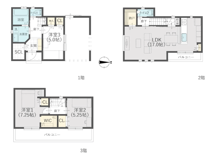 各階に収納があり、家族みんなが暮らしやすい3階建てプラン