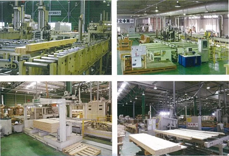 構造用集成材は、接着性能、強度性能、ホルムアルデヒド放散量などJAS適合しています。大節、割れなどを除去し、品質を均一化した材料です。無垢材を接着剤で重ね貼りして高圧プレスで圧着、表面を平らに削って製材し、曲げの剛性を測定検査します。