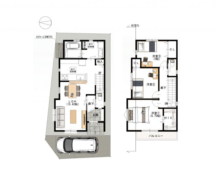 | 設備 | 温水洗浄便座、トイレ2ヶ所、追焚機能、浴室乾燥機、システムキッチン、カウンターキッチン、食器洗浄乾燥機、ウォークインクローゼット、床下収納、洗髪洗面化粧台、照明器具、電気、都市ガス、上水道、浄化槽、複層ガラス、モニタ付インターホン、ディンプルキー、■GX志向型住宅 ■耐震等級3『パワービルド工法』 ■エネファーム発電ユニット『ENETO』 | ||